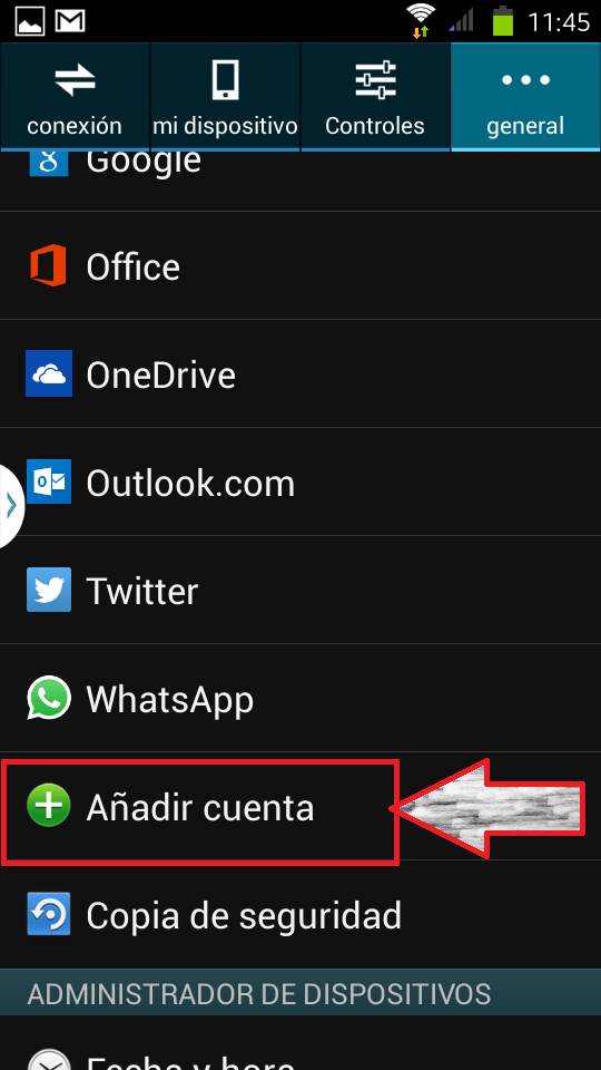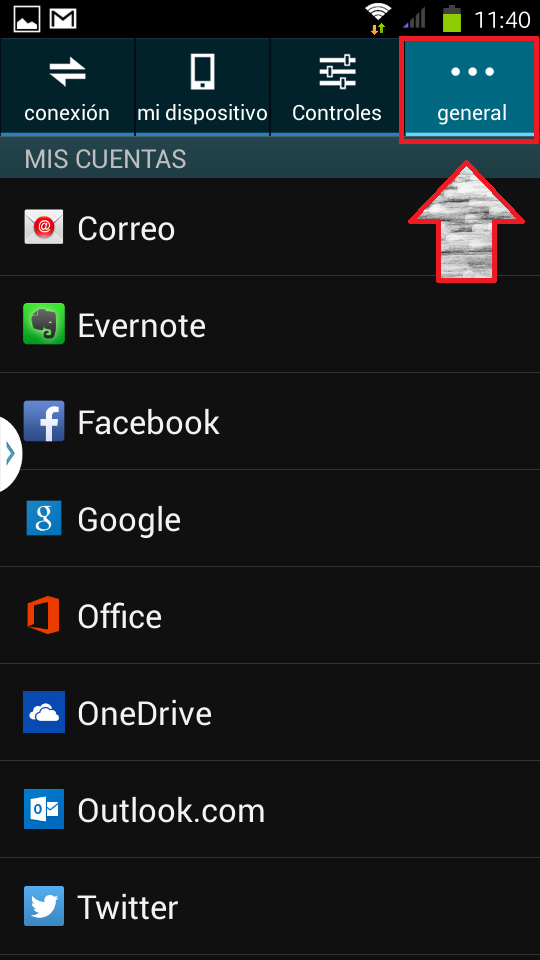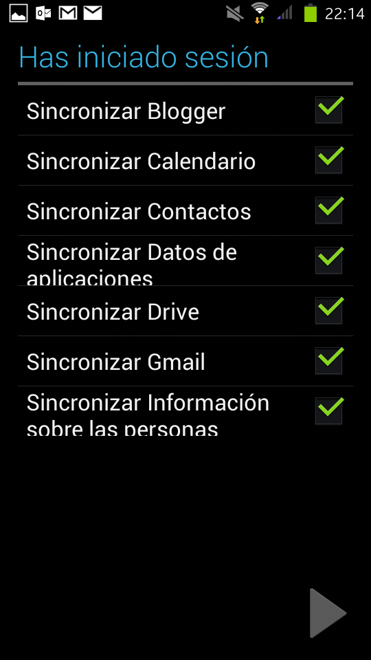 Y ya por ultimo nos saldrá la confirmación de que hemos INICIADO SESIÓN, con una lista (que según las aplicaciones que tengamos instaladas) nos aparecerán en dicha lista. Marcaremos las opciones que queremos que sincronice y para terminar avanzaremos con la flecha.