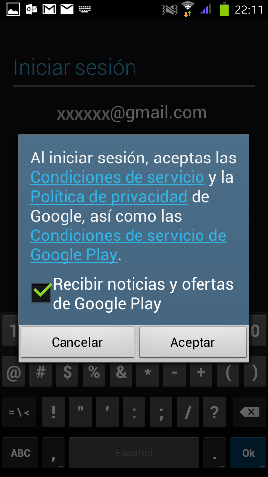 También nos ofrece la opción de poder elegir si queremos recibir noticias y ofertas de Google play (En la actualidad Play Store). En el caso de no querer, habría que desmarcar el check. Y cuando pulsemos Aceptar, estamos dando nuestra conformidad a sus condiciones de uso, servicios y politica de privacidad.