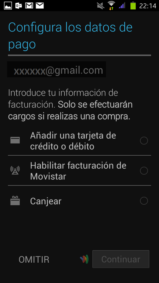 Una vez pulsemos ACEPTAR, nos mostrará las opciones de configuración de datos de pago (esta opción nos serviria por si queremos configurar una forma de pago para comprar aplicaciones con un coste.) pero ES OPCIONAL. Simplemente pulsaremos sobre OMITIR, y pasariamos a las siguientes opciones.