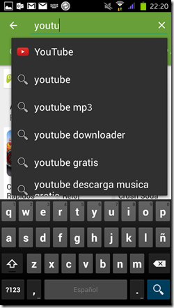 En este caso vamos a instalar la aplicación YouTube, en la cual como podéis observar en la imagen, en cuanto empezamos a escribir, se va mostrando una lista en la parte de abajo, con las distintas aplicaciones, y en la cual podemos ver que es la primera. Con pulsar sobre ella nos llevaría directamente a la aplicación. La otra opción seria terminar de escribir completamente y darle al botón de la lupa que aparece en la parte inferior derecha. Con este paso nos llevará a una ventana con todas las aplicaciones disponibles con el nombre introducido. En este caso vamos a usar la primera opción.