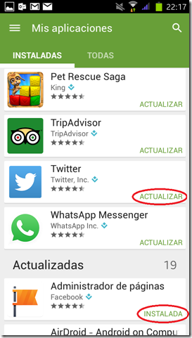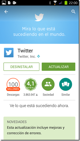 Las primeras de la lista serán siempre las que estén “pendientes” de actualizar, puesto que han publicado una nueva versión. Y más para abajo de la lista nos saldrán las que tenemos instalada con la última versión disponible. Nosotros vamos a Actualizar en esta ocasión la aplicación de Twitter. Una vez que entremos en la aplicación, tendremos las opciones: Desinstalar o Actualizar.