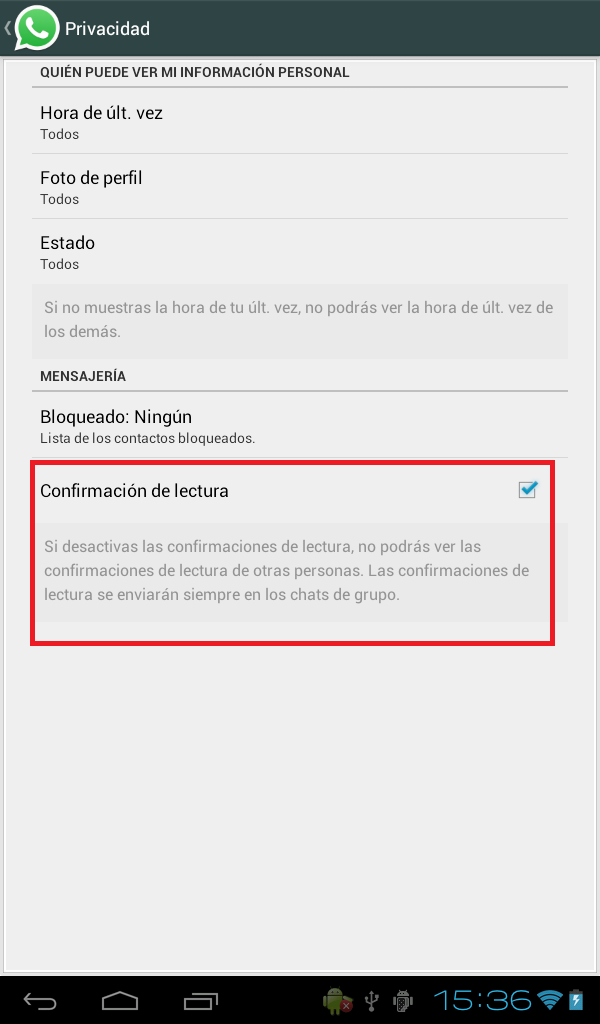 Una vez que estemos en las opciones de privacidad, en la parte inferior, tenemos la opción de Confirmación de lectura. Si esta activado, enviaremos el check azul a la persona que nos haya enviado un mensaje y nosotros lo hayamos leido. En caso contrario no será enviado, al igual que nosotros (como hemos indicado más arriba) no podremos ver la confirmación de nuestros mensajes enviados.