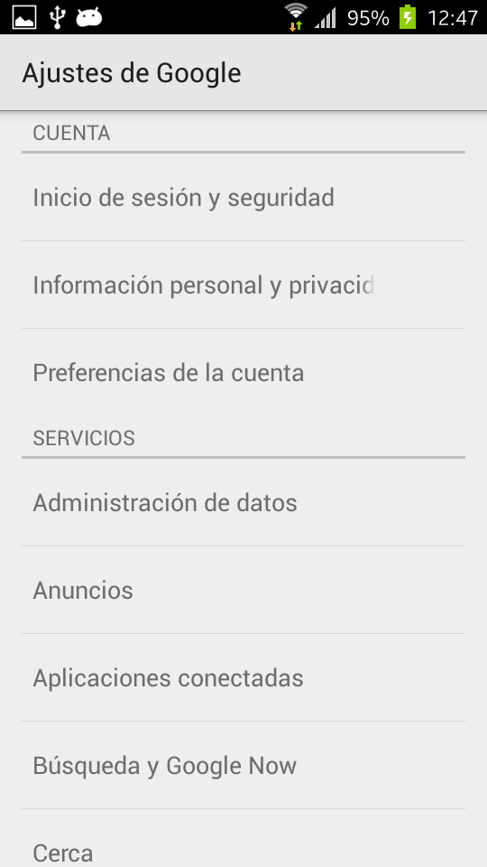 Una vez entremos en Ajustes de Google, tendremos todas las opciones divididos en dos grupos: