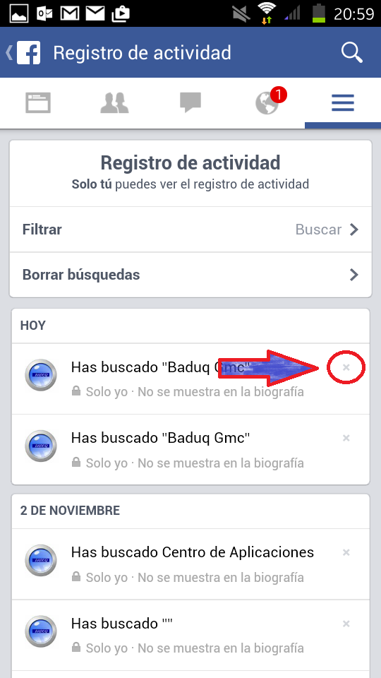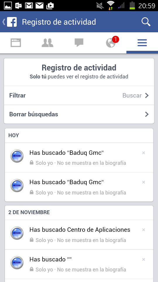 Una vez pulsemos sobre EDITAR, nos mostrará el “Registro de Actividad”, y en el cual podemos observar además de las actividades las “búsquedas” que hemos realizado de cualquier persona, pagina, etc…