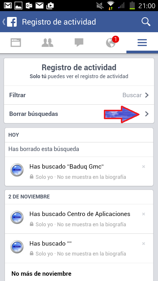 Facebook añadió en sus opciones de configuración el “Registro de Actividad”. Con esta opción, podemos comprobar toda la actividad que hemos tenido en la aplicación (tanto en aplicaciones móviles, como en la web desde un Pc. Pero dentro de ese registro, también muestra las búsquedas de personas, paginas, grupos, etc…. que hemos realizado....