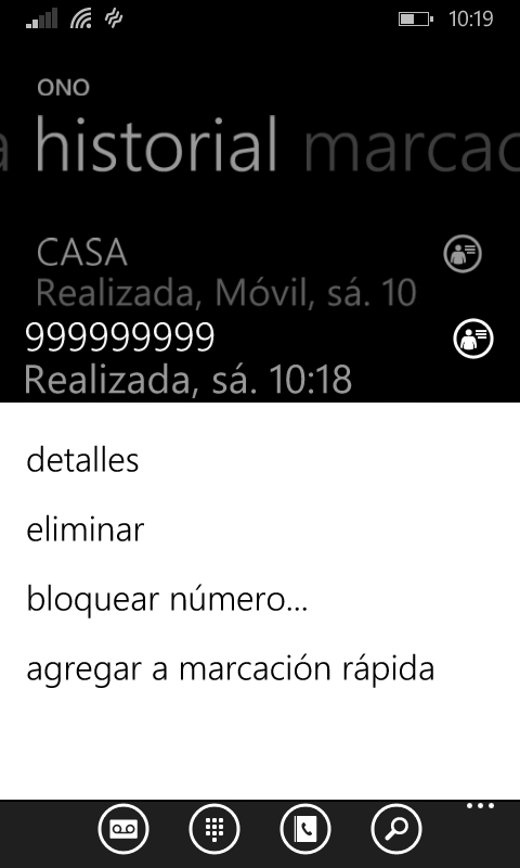 Para ello iríamos al historial de llamadas, y manteniendo pulsado sobre el número a bloquear nos aparecerá un menú con las opciones que podemos aplicar, como podemos observar en la imagen de abajo.
