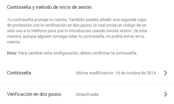 En la imagen anterior, podemos ver, cuando fue la ultima vez que se cambio la contraseña, y si tenemos activada o no la verificación en dos pasos. En contraseña si pulsamos sobre la fecha, nos llevará a la pantalla para poder cambiarla.