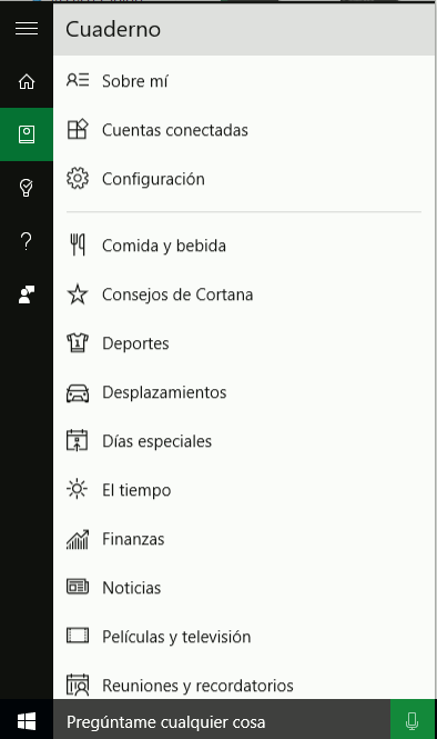 Si queremos activarlo, para ello, haremos clic sobre Cortana --> Cuaderno --> Configuración.