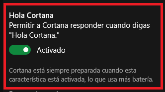Repito que esta opción, simplemente es para activarla mediante la voz al decir: "Hola Cortana", pero igualmente sin activar esta opción, podemos hacer uso de la voz simplemente pulsando sobre el micrófono que tenemos a la derecha del recuadro.