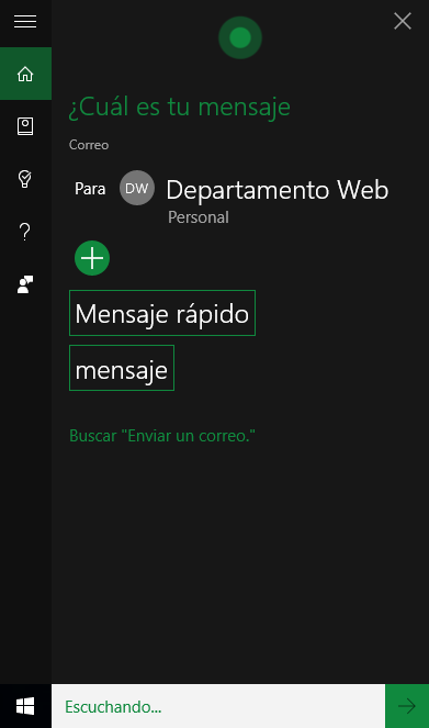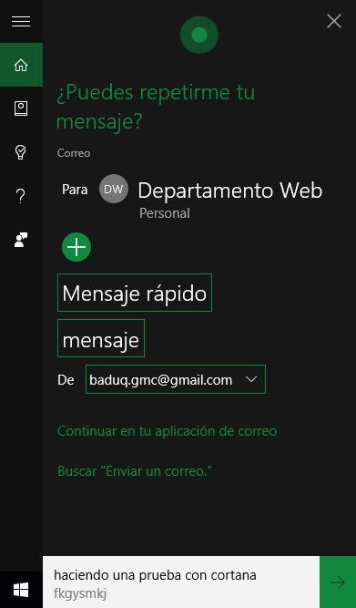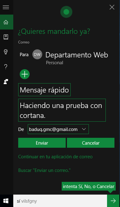 Otra de las cosas que puede hacer por nosotros, es enviar un correo electrónico (sencillito), solo podremos dictarle texto. Mediante los comandos de voz (de momento) no podemos indicarle que adjunte algún fichero a nuestro correo, pero bueno, seguramente todo se andará.