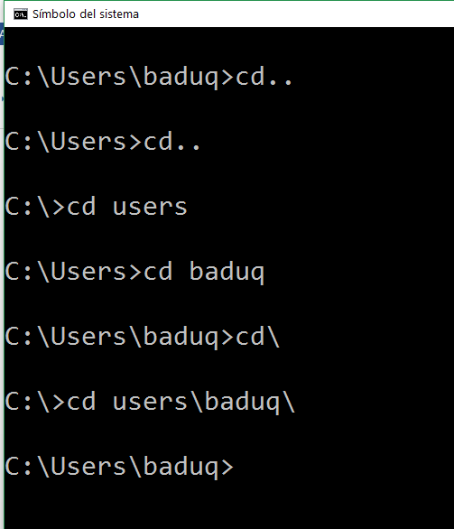 O si estamos en C:\ y queremos ir a users\baduq , la línea de comandos será esta… Cd users\baduq