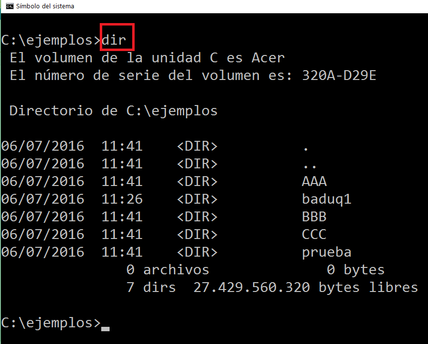 Como vemos en la imagen anterior, hemos hecho un DIR estando en C:\ejemplos\ y nos ha mostrado los directorios que contiene el directorio ejemplo.