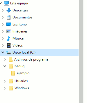 Nuestro disco C, contiene las carpetas arriba detalladas, nosotros vamos a fijarnos en la línea de Baduq, podemos observar que dentro de baduq se encuentra otra carpeta que se llama ejemplo.