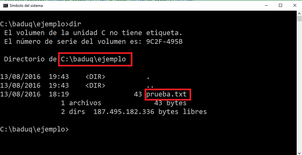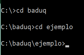 Si nos encontráramos en C: y quisiéramos ir a la carpeta ejemplo que está dentro de baduq, podríamos hacerlo de dos formas: