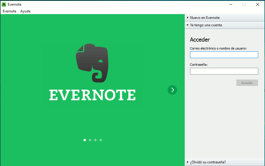 La primera vez que abramos la aplicación, nos preguntará si queremos crear una nueva cuenta Evernote, o si ya disponemos de una, es un paso imprescindible para poder usarla.