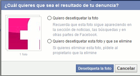 Y ya, por último, al pulsar sobre el botón, nos saldrá una ventana en la cual nos preguntará el motivo de la “denuncia”. Si queremos solo “desetiquetar”, o que también la foto sea eliminada.