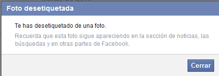 Una vez marcada la opción deseada y pulsando sobre "Desetiqueta la foto". Nos aparecerá un cuadro de confirmación. Indicándonos el resultado de nuestra petición.