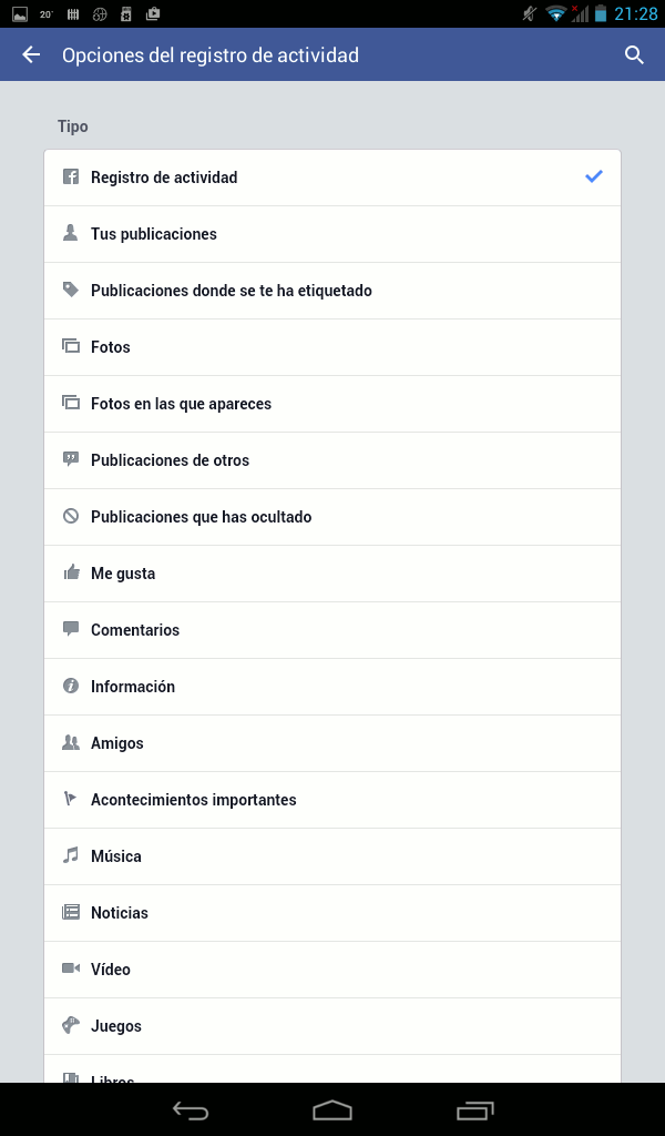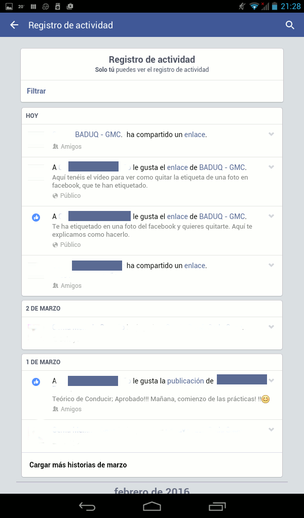 Una vez dentro del menú de Registro de actividad, nos aparecerá los últimos “movimientos” de nuestra actividad en Facebook. En la parte de arriba de la siguiente imagen, pulsaremos sobre “Filtrar”.