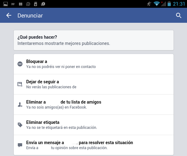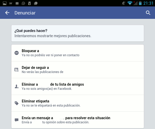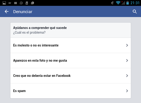 Una vez que pulsemos sobre “Denunciar” aquí es donde se encuentra una pequeña diferencia entre hacerlo desde la web (como os explicamos en otra entrada) o hacerlo desde la aplicación para Android. En esta última, tenemos diferentes y más opciones que desde la propia web.