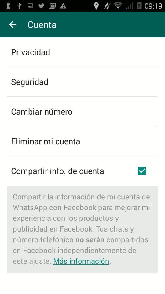 Pues por defecto viene marcada una opción, que es la de Compartir la información de mi cuenta de WhatsApp con Facebook para mejorar mi experiencia con los productos y publicidad en Facebook.