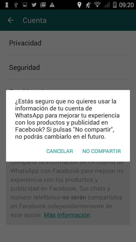 Antes de desmarcarlo, nos mostrará el mensaje de confirmación , y nos informará de que si decidimos “No compartir”, no podremos cambiarlo en el futuro.