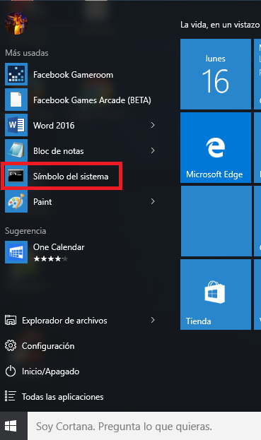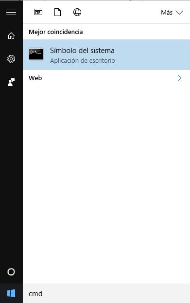 Y después símbolo del sistema. En nuestro ejemplo lo tenemos en el mismo menú pero si no os apareciera, escribir “cmd” y os aparecerá.