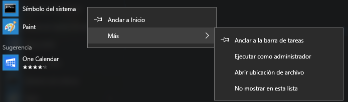 Haremos click con el botón derecho en Simbolo del sistema y nos aparecerá un menú.