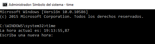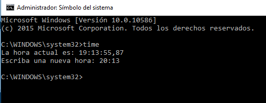 Nos pedirá que introduzcamos la hora nueva. Y lo haremos en este formato XX:XX Donde las X es la hora que queramos introducir, por ejemplo las 20:13 y después pulsaremos Intro.